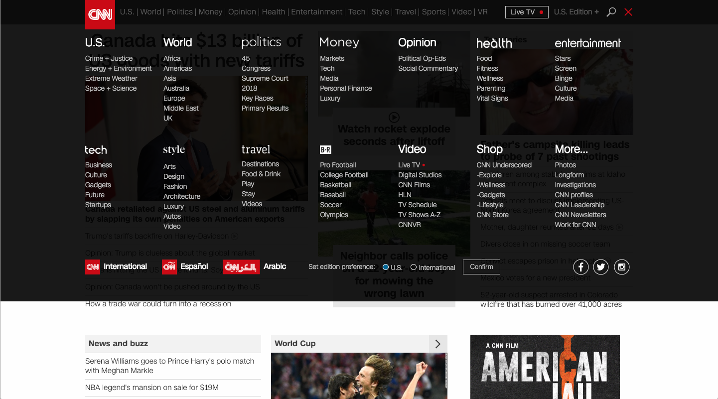 I worked across multiple business units to craft the current state of CNN's site navigation. I also worked with the Ads product team to create a new, responsive web ad unit at the top of the page to replace the page skins we had been using.